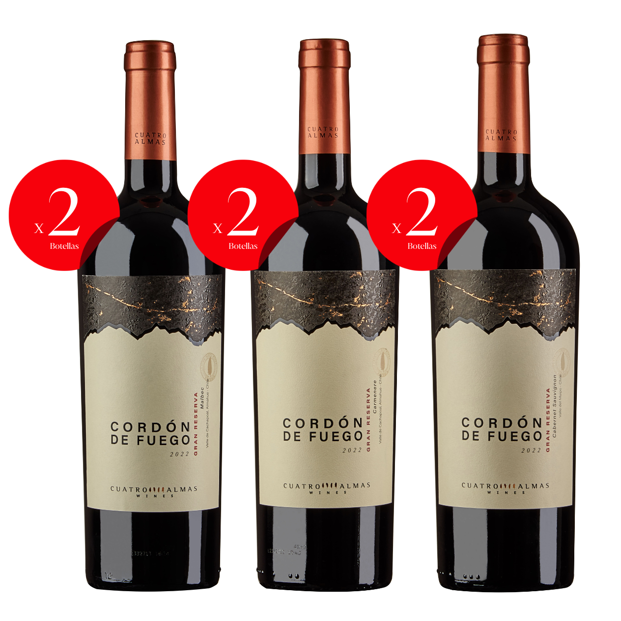 Descubre la esencia clásica del Maipo Andes con esta Colección Esencial Cordón de Fuego Gran Reserva 2022. Tres variedades, seis botellas, innumerables momentos por crear. ¡Añade la colección a tu carro y vive la experiencia 4 Almas!